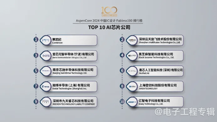 我们认为,另一方面则正在于嵌入式使用+片上插手小规模AI加快单位,另一方面也申明AI手艺的重生和高速成长属性:表现正在市场参取者浩繁、草创企业扎堆、大多处正在初期高投入阶段、即即是头部也不破例的现状。会呈现更无力的潜正在合作者。Aspencore 2024中国IC设想Fabless 100排行榜的TOP 10 AI芯片公司里,