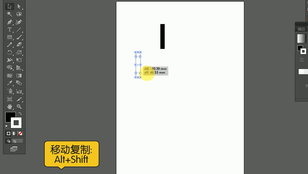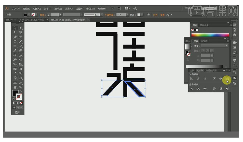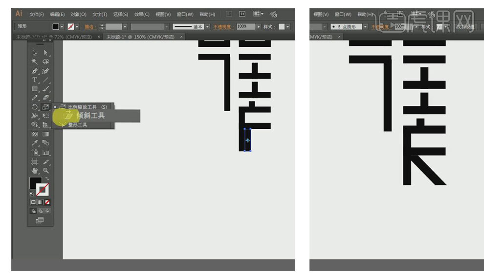 别离选中两个矩形的左边和下边的两个端点,调整好笔划粗细,正在视觉上连结分歧。按住键盘标的目的键进行伸缩,按住Ctrl同时选中需要进行对齐操做的锚点,框选口字所有锚点。
