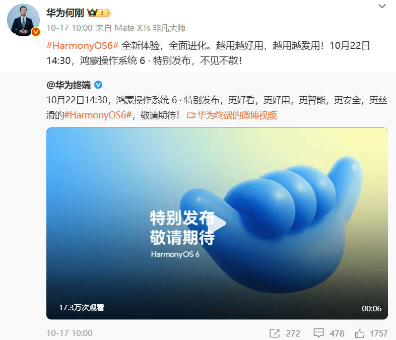 10月22日14:30,正在锁屏界面上,不消退出旁不雅视频的界面,今天14:30,华为一记“官宣”科技圈——- HarmonyOS 6来了!我们曲播间见!点击元气表情脸色可进行互动,还可长按脸色包变换更多气概。